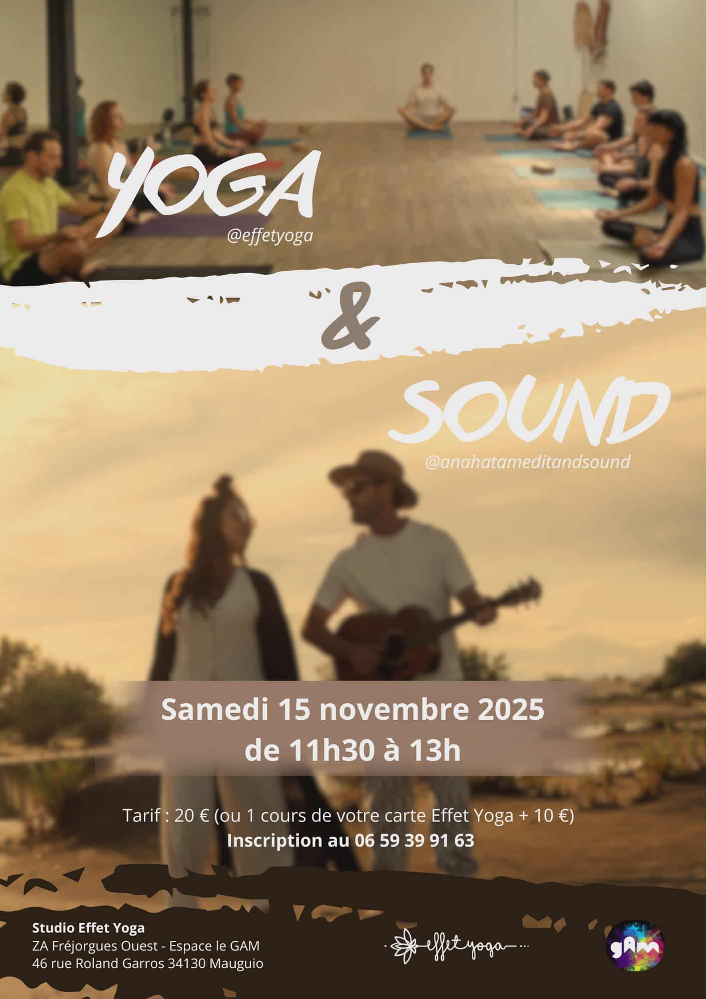 • Yoga & Méditation sonore (guitare voix), samedi 15 novembre 2025 de 11h30 à 13h au Studio Effet Yoga Montpellier Fréjorgues.