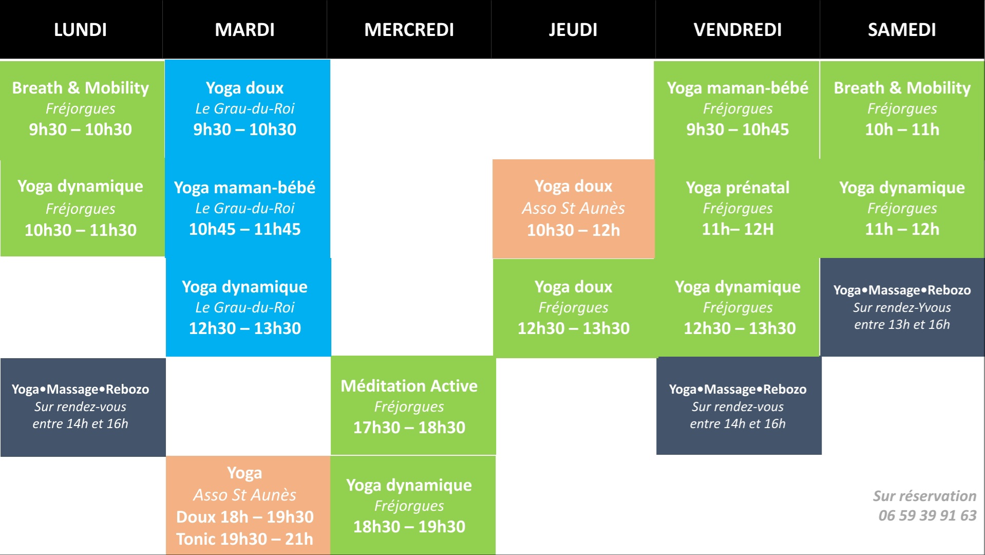 Pendant les vacances scolaires de la zone C : cours annulés à St Aunès et au Grau-du-Roi. Les cours en vert sur le planning sont maintenus.